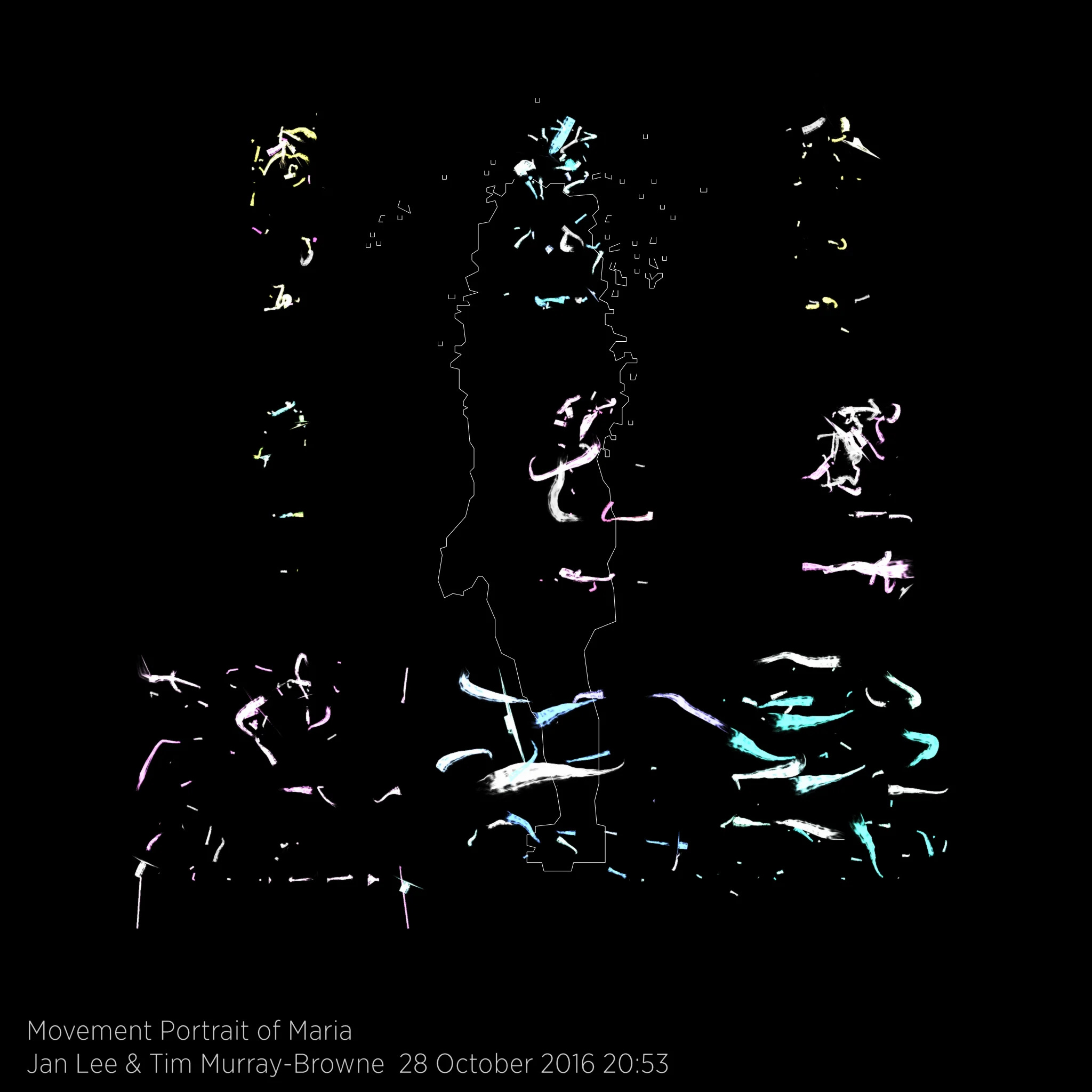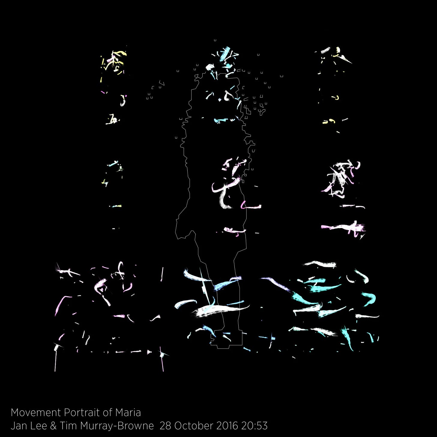 Jan-Ming and I took the body-to-paintstroke system from the dance work above and used it to create algorithmic portraits of how someone moves. We called this work Movement Alphabet.