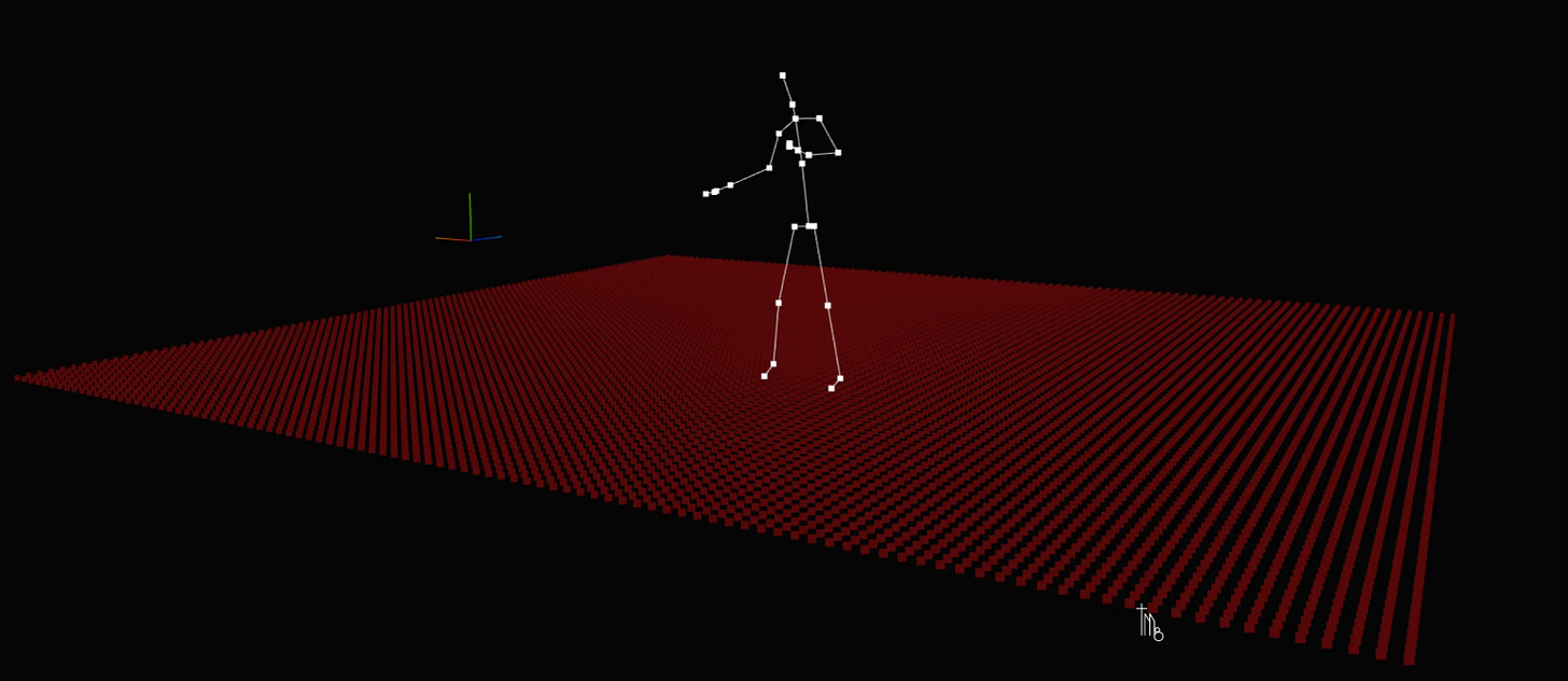 This was more data than my brain could design for. I could easily code trigger zones, and parameters that go up and down as your hands go faster or slower - but these all see the body as a set of independent labelled particles moving through space. They’re about body parts rather than the body as a whole. Essentially, my code was reducing the immense dynamic range of the body to these tiny little digital abstractions I just invented.
